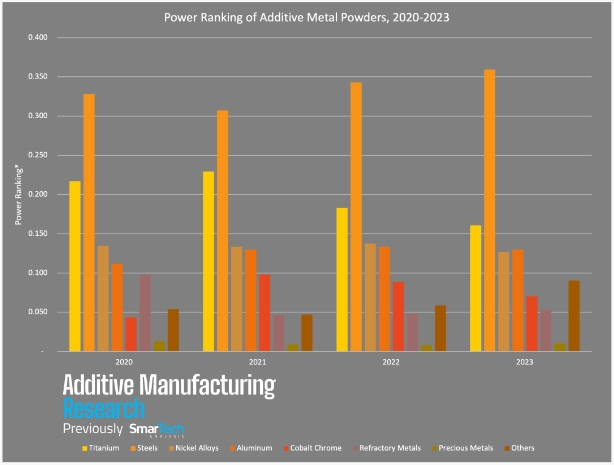 近期,增材制造研究(AMR)公布了一項關于金屬材料使用率的相關調查結果,從其繪制的最新圖表中可看出金屬增材制造粉末中各種金屬的實力排名