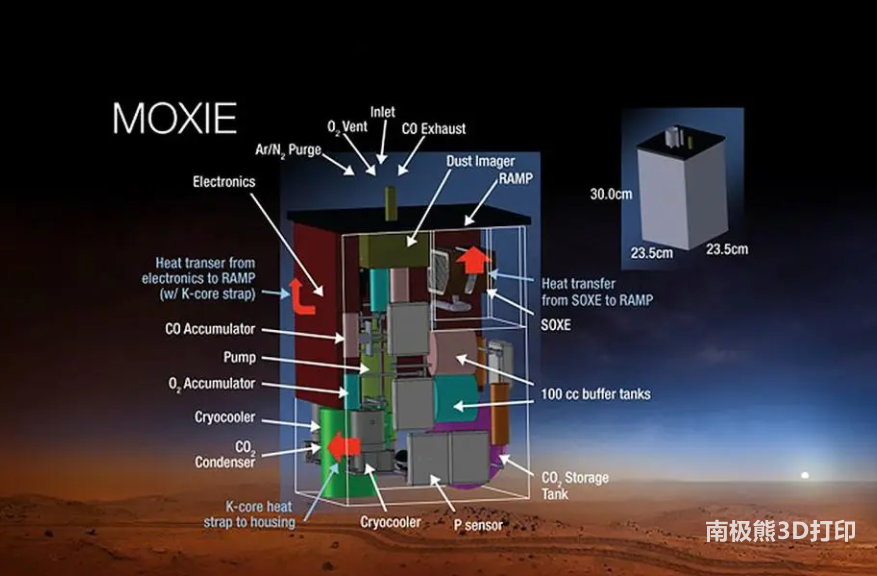 "毅力號(hào) "火星車的其他6個(gè)3D打印部件在 "火星氧氣原位資源利用實(shí)驗(yàn) "儀器中,簡稱MOXIE。這個(gè)設(shè)備將測試新的技術(shù),未來可以生產(chǎn)工業(yè)數(shù)量的氧氣,在火星上制造火箭推進(jìn)劑,幫助宇航員發(fā)射回地球。